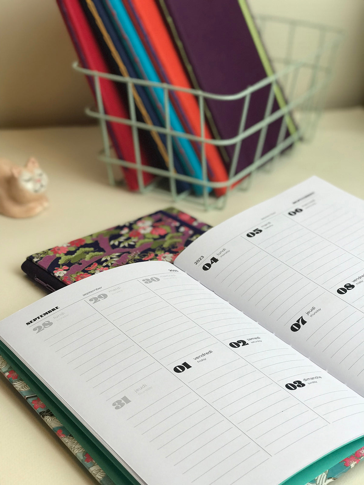 Chaque carnet est différent et unique. Certains modèles, dont les agendas, sont faits à la demande pour éviter le gaspillage. Réutilisation des chutes de papier.