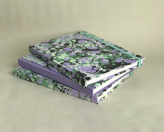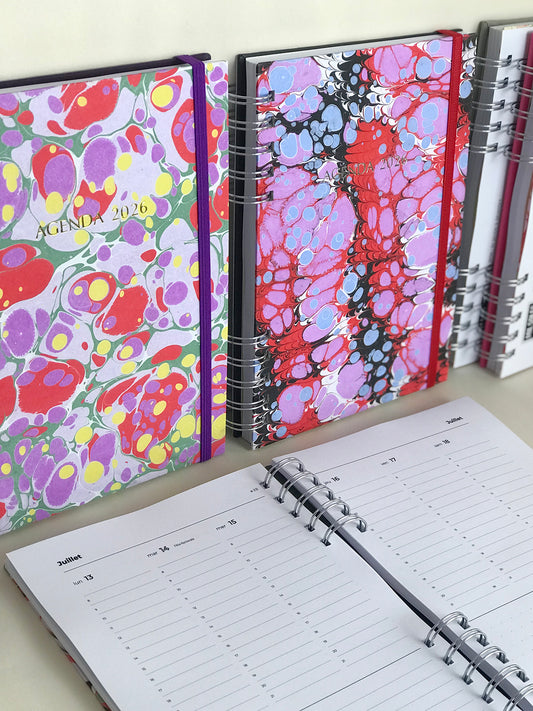 Ma nouvelle collection de carnets aux couvertures en papier marbré artisanal imprimé à l'atelier.