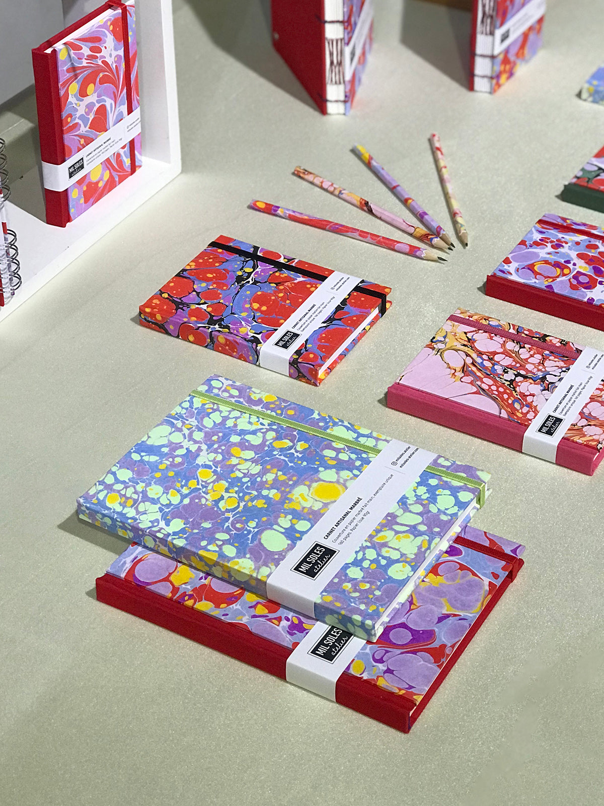 Un carnet polyvalent pour capturer vos idées et inspirations. Sa couverture rigide est fabriquée avec un papier marbré unique, réalisé à la main selon une technique traditionnelle. C'est l'élément qui fait de ce carnet un objet singulier : chaque motif est formé au fil de l’eau, rendant chaque couverture totalement unique — aucun carnet ne ressemble à un autre !